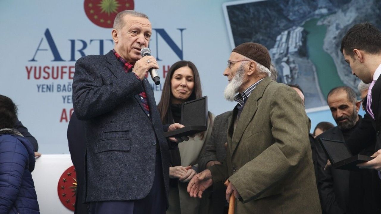 Cumhurbaşkanı Recep Tayyip Erdoğan, Yusufeli Barajı gölü altında kalacak olan ilçenin yeni yerleşim yerinde yapılan TOKİ evlerinin sahiplerine anahtar teslimi gerçekleştirdi.
