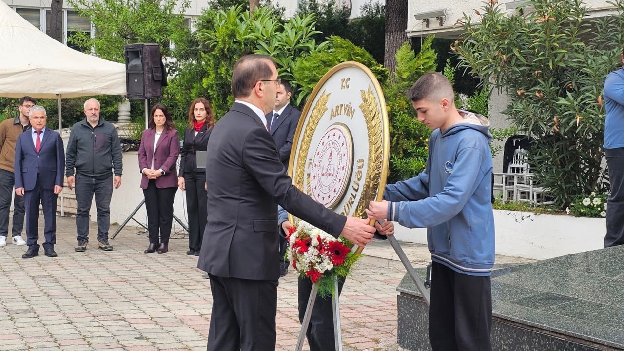 Tören, saygı duruşunda bulunulması ve İstiklal Marşı’nın okunmasıyla başladı. Ardından İl Millî Eğitim Müdürü Fahri Acar, öğrenciler eşliğinde İl Millî Eğitim Müdürlüğü çelengini Atatürk Anıtı’na sundu.