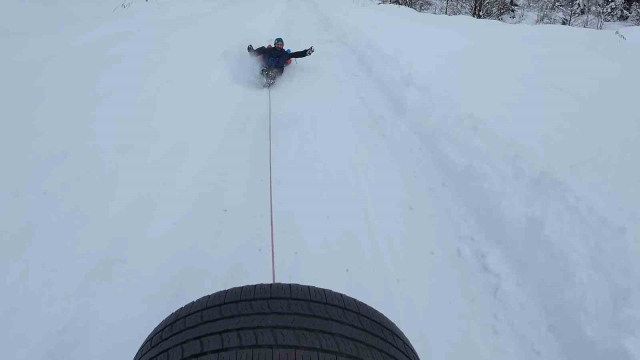 Rize'de şiddetli kar yağış kenti beyaza bürüdü. Yaylalarda 1 metreyi aşan kar fotoğraf tutkunlarına kartpostallık görüntüler verirken adrenalin tutkunlarına da keyifli dakikalar yaşattı. Adrenalin tutkunu Oğuz Bal ve Volkan Aytaç isimli 2 arkadaş, yağan karı fırsat bilerek Rize'nin İkizdere ilçesindeki Sivrikaya Yaylası'na çıktı. 4x4 araçlarının arkasına bir ip vasıtası ile branda bağlayan 2 kafadar, yanlarında bulunan diğer arkadaşlarından aracı sürmesini rica etti. Brandanın üzerinde oturan 2 kafadar arabanın da kendilerini çekmesiyle karda kayarak keyifli anlar yaşadı. Sürücü olan arkadaşlarına 'biraz yavaş gitsene vicdansız' diye seslenseler de bununla da yetinmeyen ikili bu kez brandanın üzerinde ayağa kalktı. Ayakta da kaymayı başaran Aytaç ve Bal'ın o anları renkli görüntülere sahne oldu.