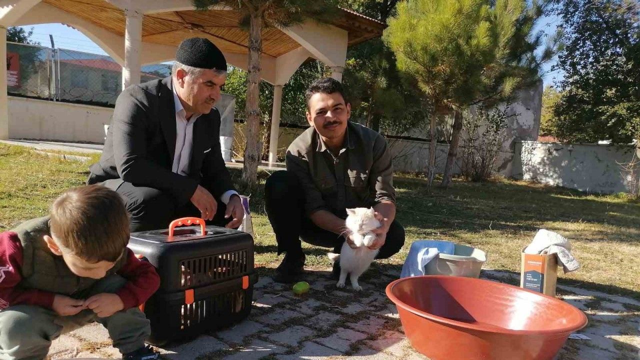 Astsubay Ömer Halisdemir Camii İmam Hatibi Yunus Çaykara, cami etrafında yuvalanan yaklaşık 10 kediye adeta bebek gibi bakıyor. Kedilere mama ve su veren Çaykara, leğende yıkadığı kedilerin tarakla tüylerini de tarıyor. Çaykara’nın kedi sevgisi, cemaati ve diğer imam arkadaşlarını da etkiledi. Yunus Çaykara, "Tabii bizler camilerimizde, vaazlarımızda merhametten, sevgiden, hoşgörüden bahsediyoruz. Bunları tabii cemaatimiz insanlar üzerine anlıyorlar. Ama bizler diyoruz ki sadece insanların üzerine merhamet olmaz. Hayvanlara da merhamet, şefkat, sevgi lazım. Biz bunun farkındalığını oluşturmak adına camimizde yaklaşık 10 civarı kedinin bakımını üstleniyoruz. Onlara her vakit geldiğimiz zaman mama ve sularını temin ediyoruz. Tabii coğrafyamız biraz soğuk bir coğrafya, 30’ları dahi görebiliyor. Hayvanların o soğukta sıkıntı yaşamaması için bizler camilerimizin altında sığınak tarzı bir yer, sıcak bir bölge ayarladık. Kışın yemek bulmak da tabii zor oluyor hayvanlar için. Biz yine aynı şekilde her gün hayvanların yemlerini, mamalarını ve sularını temin ediyoruz. Bunun dışında hayvanlarda herhangi bir hastalık olduğu zaman en yakın veterinere gidip, orada onların mesul tedavisi varsa tedavilerini üstleniyoruz. Ve yine bakımlarını yapmaya devam ediyoruz" dedi.