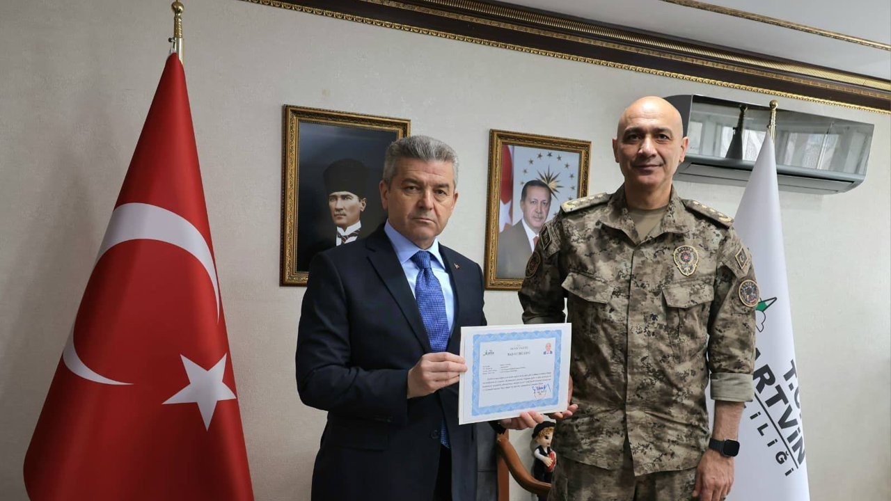 Artvin Valisi Dr. Turan Ergün, asayiş ve güvenliğin sağlanmasında önceki yıllara göre elde edilen başarılı çalışmalar neticesinde ilin ülke genelindeki istatistiklerde üst sıralara çıkması dolayısıyla, göstermiş oldukları gayret ve özverili çalışmaları nedeniyle İl Emniyet Müdürü Murat Güneş ve İl Jandarma Komutanı J. Alb. Uğur Başkonak’a “Başarı Belgesi” takdim etti.