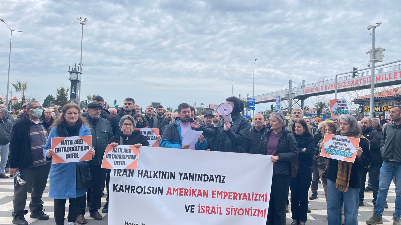Grup adına basın açıklamasını okuyan Atakan Aslıbay, ABD’nin İran’a yönelik tehditlerini doğrudan saldırganlığa dönüştürdüğünü savundu. Açıklamada, Ortadoğu’da Libya ve Suriye ile başlayan sürecin İsrail’in Filistin’e yönelik saldırıları ve Lübnan’a dönük tutumuyla genişlediği ifade edilerek, bölge halklarının yıkım ve sömürüyle karşı karşıya bırakıldığı öne sürüldü.