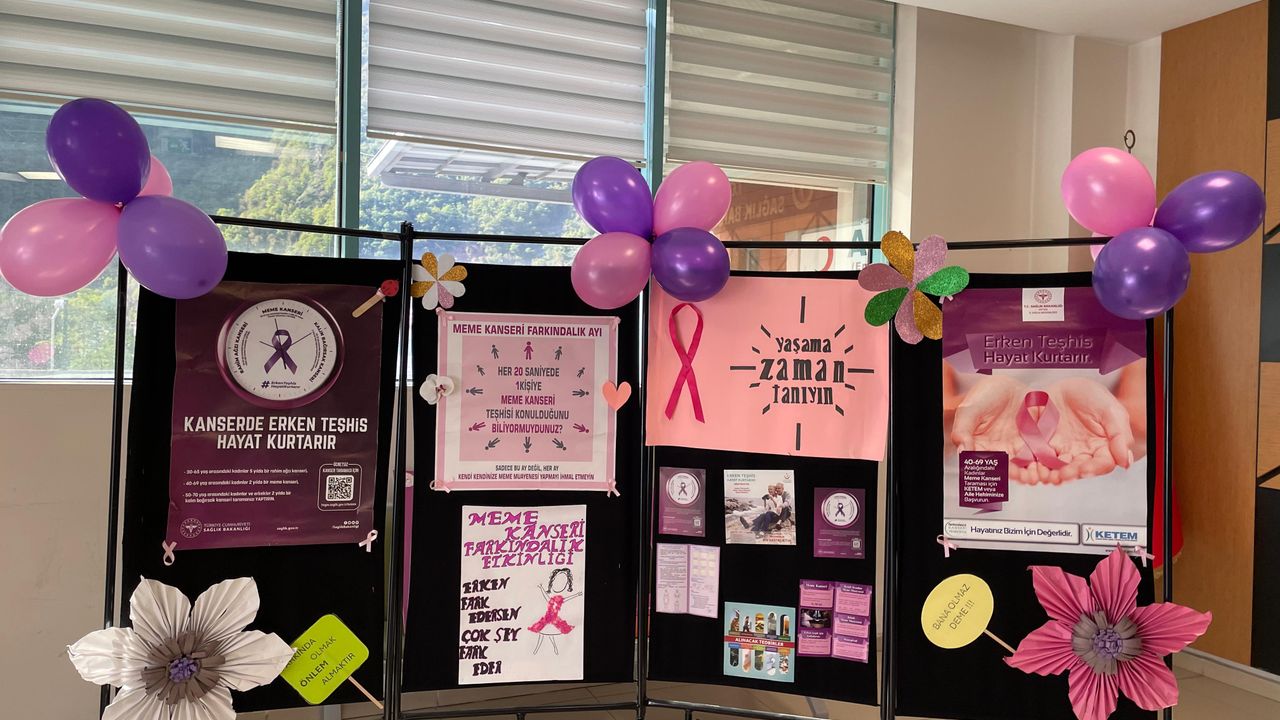 Stantta vatandaşlara meme kanserine dair çeşitli broşürler dağıtılırken, erken teşhisin önemi vurgulandı ve konu hakkında bilgi verildi.
