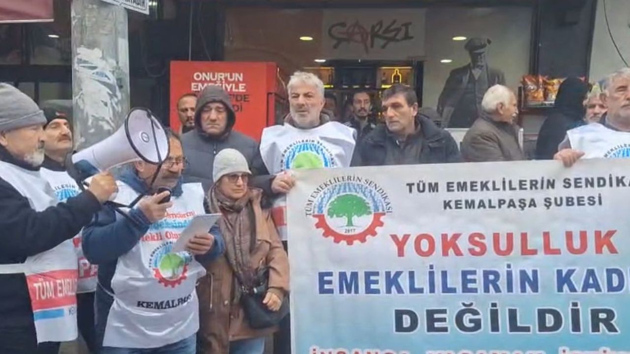 Tüm Emeklilerin Sendikası üyeleri, emekli maaşlarına yapılan son zamları protesto etmek amacıyla Kemalpaşa ilçesinde yürüyüş ve basın açıklaması gerçekleştirdi. Halvaşi Köprüsü’nde toplanan grup, Kemalpaşa Cumhuriyet Meydanı’na yürüyerek meydanda basın açıklaması yaptı.
