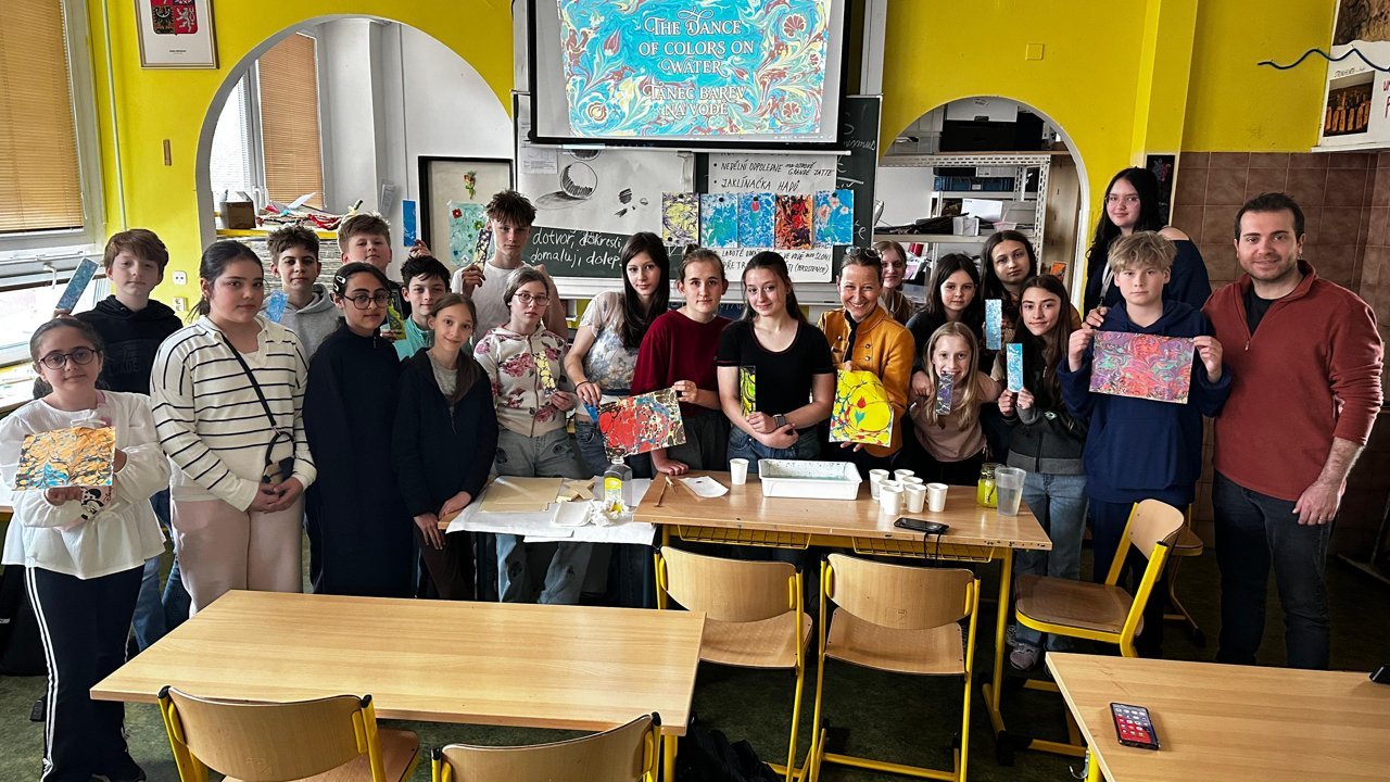 Hopa BİLSEM Görsel Sanatlar Öğretmeni Hakkı Fidan rehberliğinde gerçekleştirilen etkinlikte, 23 Nisan haftası kapsamında geleneksel Türk sanatlarından ebru sanatı uluslararası öğrencilere tanıtıldı.