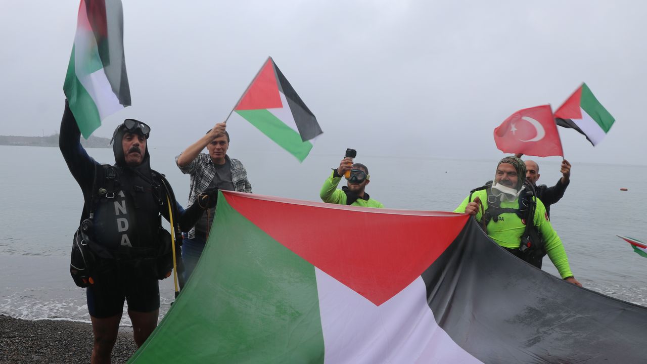 Bir süre deniz altında gezen Ersoy ve Koçal, Türk ve Filistin bayrakları açtı.