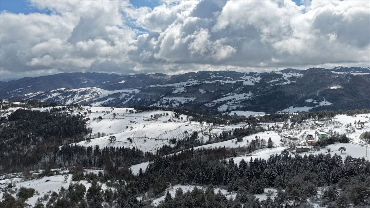 İlçe merkezine 25 kilometre uzaklıktaki 1320 metre rakımlı Kızlan Yaylası da kar yağışının ardından beyaza büründü.