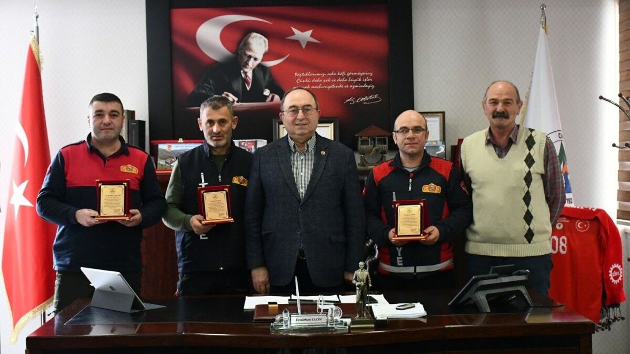 3 kişilik Artvin Belediyesi itfaiye ekibi deprem bölgesindeki arama kurtarma çalışmalarını tamamlayarak Artvin’e geri dönmesi üzerine itfaiyecileri, Belediye Başkanlık makamında ağırlayan Başkan Elçin gösterdikleri çabadan dolayı arama kurtarma ekibine teşekkür ederek plaket taktim etti.