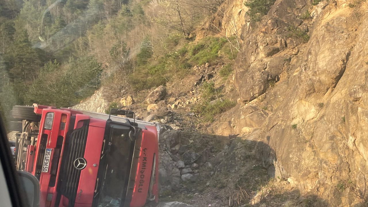 Öte yandan, devrilen tır henüz yoldan kaldırılmazken, kaza nedeniyle ulaşım kontrollü bir şekilde sağlanıyor.