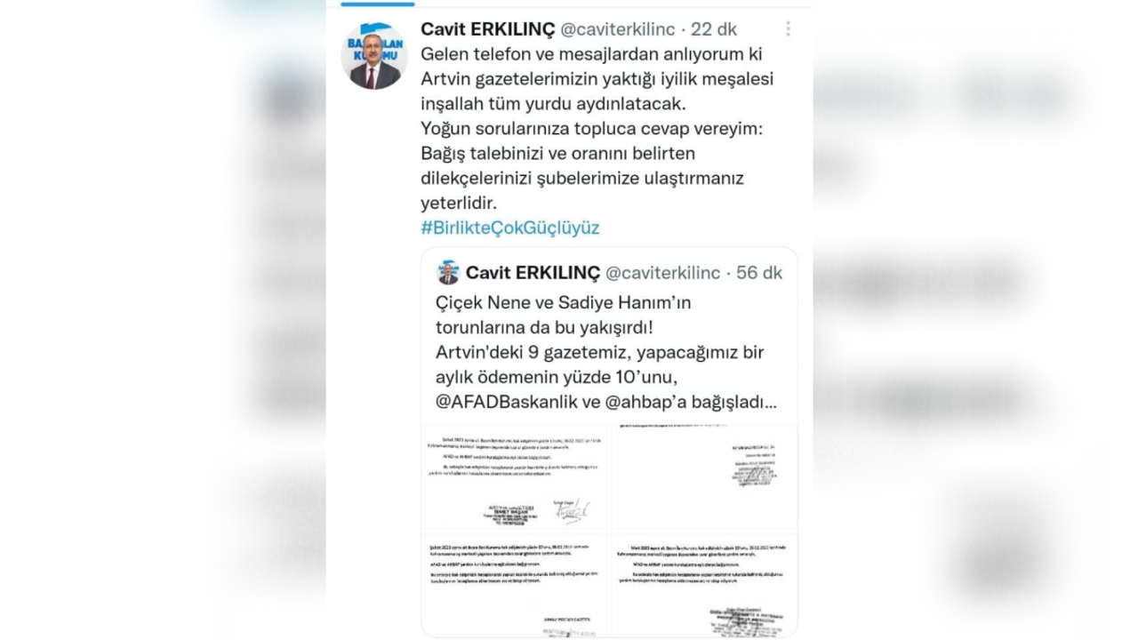 Basın İlan Kurumu Genel Müdürü Cavit Erkılınç, gazetecilerin bu anlamalı tutumu sonrasında sosyal medya hesabından yaptığı açıklamada “Çiçek Nene ve Sadiye Hanım’ın torunlarına da bu yakışırdı! Artvin'deki 9 gazetemiz, yapacağımız bir aylık ödemenin yüzde 10’unu, @AFADBaskanlik ve @ahbap’a bağışladı. Gazetelerimize örnek davranışları nedeniyle şükranlarımı sunuyorum. Darısı diğer gazetelerimizin başına.” İfadelerine yer verdi.