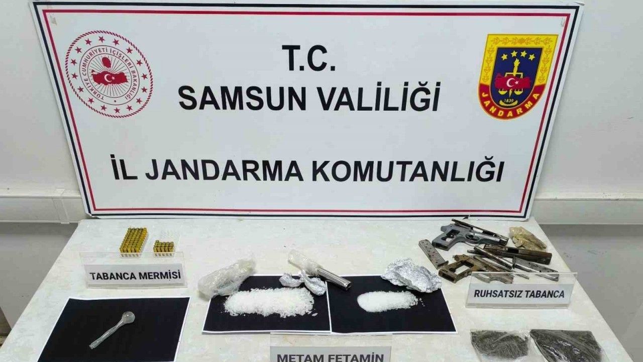 Edinilen bilgiye göre, Samsun’un Çarşamba ilçesinde jandarma ekiplerinin uyuşturucu ticaretinin önlenmesine yönelik yürüttüğü çalışma kapsamında bir şahsın evine operasyon düzenlendi. Yapılan aramada 235 gram metamfetamin, 126 gram kubar esrar, 2 adet ruhsatsız tabanca ve 1 adet uyuşturucu kullanma aparatı ele geçirildi.
