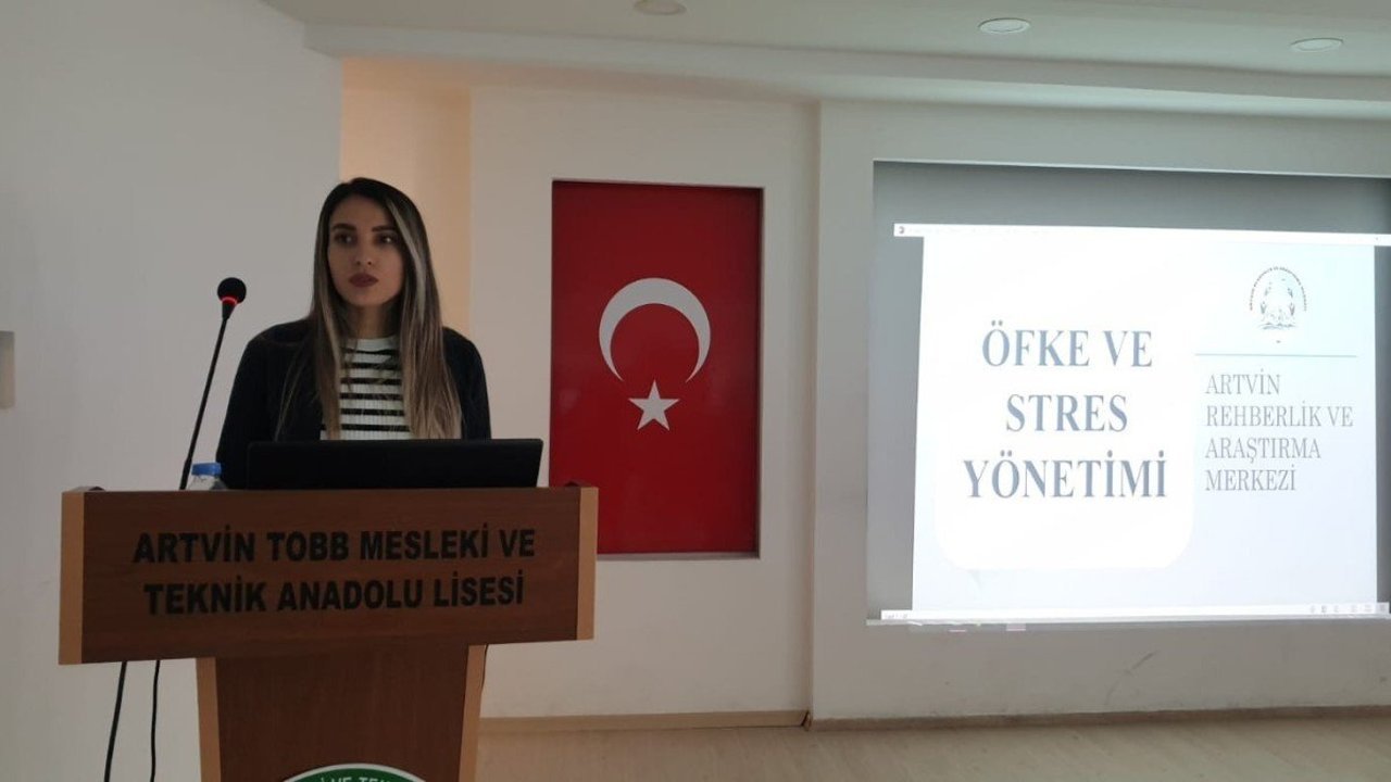 İl Müdürü Acar’ın konuşmalarının ardından Artvin Rehberlik ve Araştırma Merkezi Rehber Öğretmeni Müjde Demirtaş ve Funda Dedecan tarafından “Öfke ve Stres Yönetimi” eğitimine geçildi ve tüm katılımcılar bu konuda bilgilendirildi.