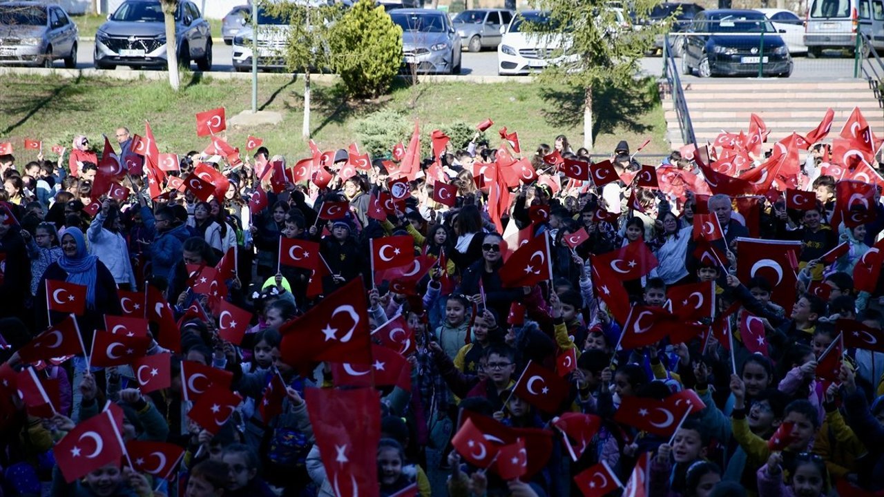 TOKİ İlkokulunda da öğrenciler, ellerindeki bayraklarla okul bahçesine girdi.