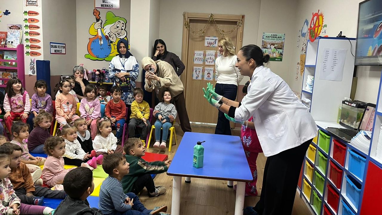 Eğitim, Toplum Sağlığı Merkezi çalışanları Laborant Mehtap Şenyürek ve Hemşire Şehriban Kanat tarafından verildi. Eğitim kapsamında çocuklara el yıkamanın önemi, doğru el yıkama teknikleri ve kişisel hijyenin temel amaçları eğlenceli ve öğretici yöntemlerle aktarıldı. Hijyen alışkanlıklarının küçük yaşta kazandırılmasının önemine dikkat çekilen etkinlikte, çocuklarla birlikte çeşitli deneyler yapılarak öğrenmenin kalıcılığı artırıldı.