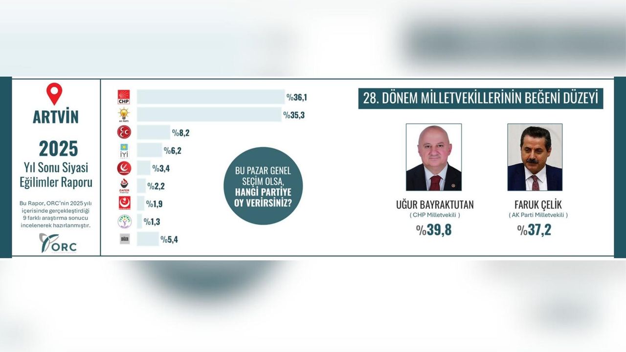Raporda yer alan “Bu pazar genel seçim olsa hangi partiye oy verirsiniz?” sorusuna verilen yanıtlara göre ise Cumhuriyet Halk Partisi (CHP) yüzde 36,1 ile Artvin’de ilk sırada yer aldı. CHP’yi AK Parti yüzde 35,3 ile takip etti. Diğer partilerin oy oranları ise şöyle sıralandı: MHP yüzde 8,2, İYİ Parti yüzde 6,2, Yeniden Refah Partisi yüzde 3,4, Zafer Partisi yüzde 2,2, DEM Parti yüzde 1,3 ve diğer partiler yüzde 5,4.