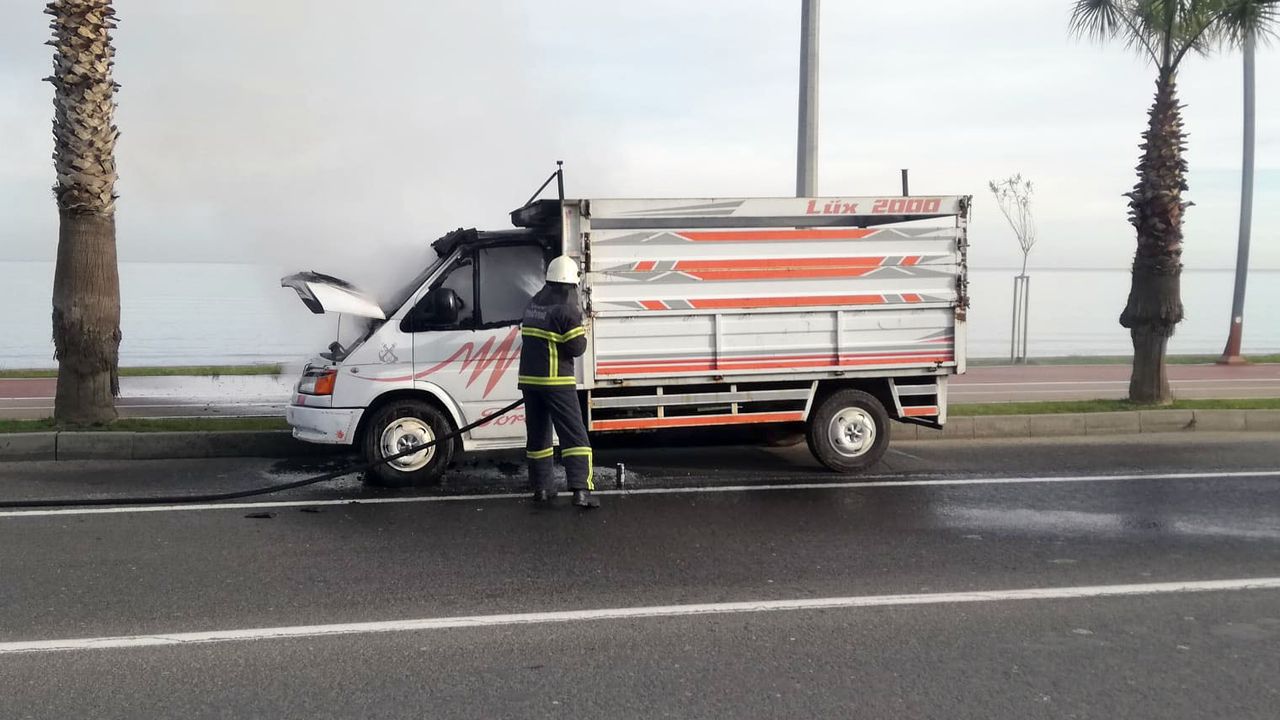 Berat T. idaresindeki kamyonette, Fevzi Çakmak Mahallesi Ünye Devlet Sahil Yolunda seyir halindeyken henüz belirlenemeyen nedenle yangın çıktı.